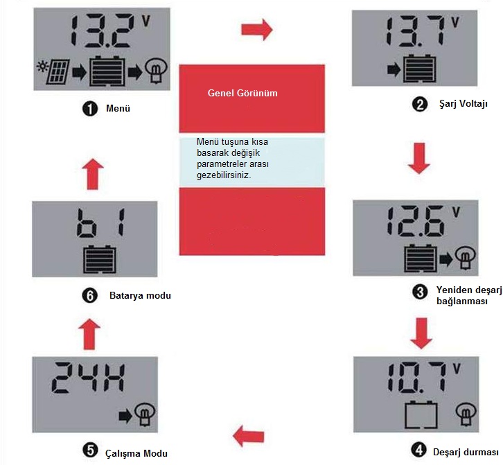 - 12V aküler için 2 adet 150W panel veya 3 adet 100W'lık panelden fazla bağlamayınız!